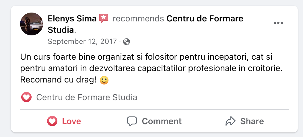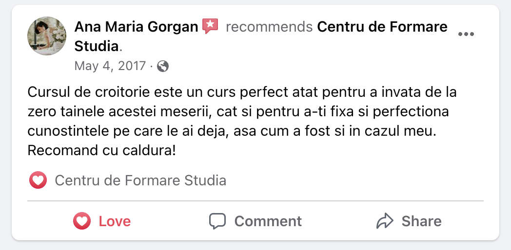 👉 Curs 100% aplicativ – Activitățile se desfășoară în ateliere complet echipate, cu mașini semiindustriale și de uz casnic, sub îndrumarea formatorilor noștri cu peste 30 de ani de experiență.